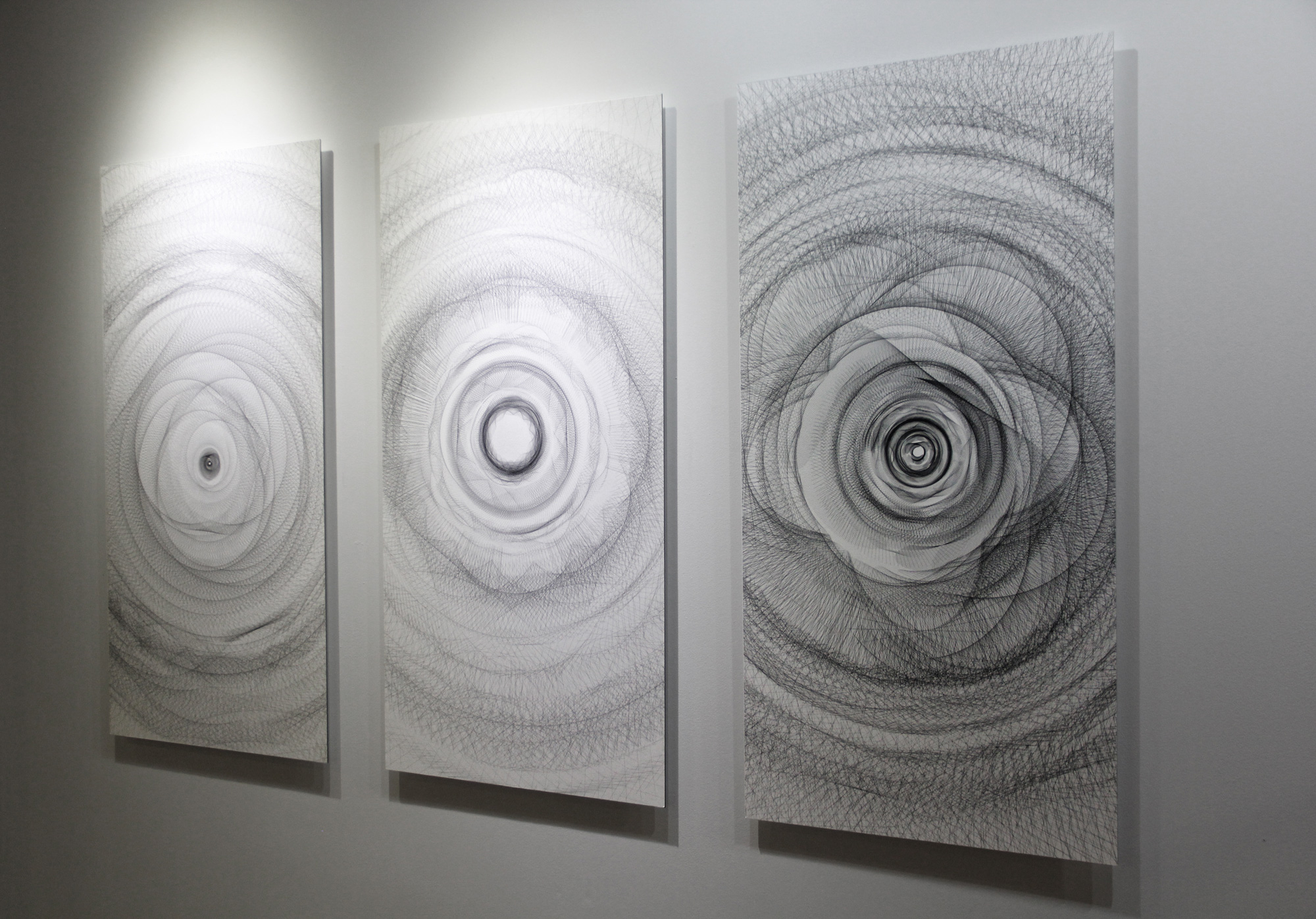 Series of digital prints on aluminium created by executing self-made algorithm multiple times. The code generates a unique visual composition each time when applied by spinning around a number of points, which create a line when colliding.