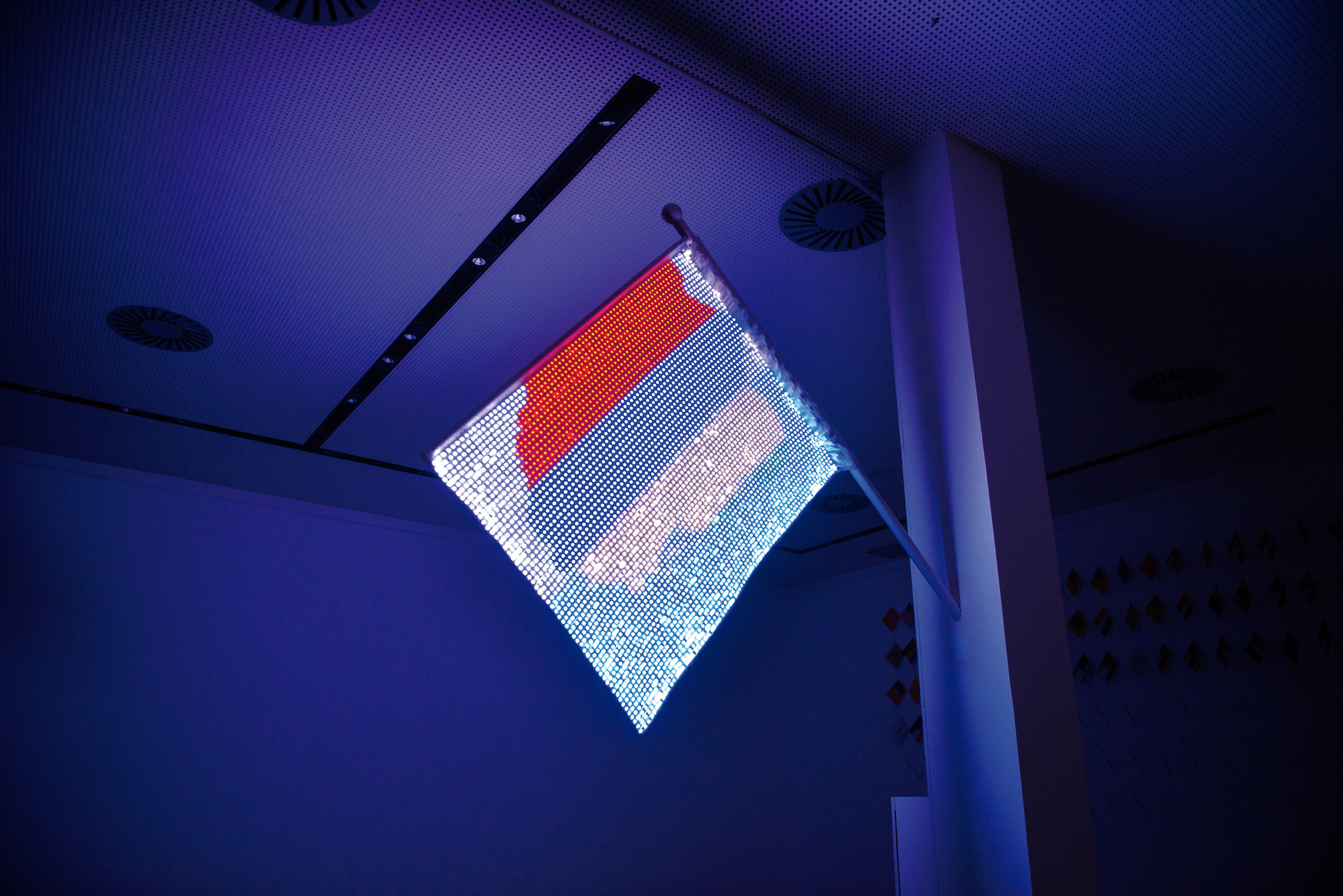 Chameleon is a white flag made of a fabric with embedded LEDs that allow it to become the flag of any country. Attached to the wall by a flagpole and a rod that keeps it spread out, the piece reacts to the people’s presence by showing in a compulsive way the flags of different countries, chosen at random from a database. The design of each flag is never completed, but mutates constantly from one nation to another, blending colours and shapes in such way that it becomes an amalgam of all flags and none of them at once. Like a scared animal who tries to adapt to its environment, the flag is immersed in a never-ending process that reminds one of the critique of cosmopolitanism by Barber: trying to represent all the nations on the planet, it ends up becoming a foreign or even alien flag. Observed from the expectation of a final shape, from the strong statement that a national flag represents, this modest cloth seems doomed to failure, since its design will never be completed. Therefore, it can be interpreted in terms of those opposing cosmopolitanism, as some- thing merely illusory and devoid of substance. Nevertheless, if it is looked at as a living process, the flag tells us about a continuous exchange in which the different countries meet and blend without hierarchies. In this way, it echoes Nussbaum’s proposal and the conciliating view of Wallerstein, who reminds us that we are living in an unequal world, subjected to constant changes. (text by Pau Waelder from exhibition catalogue ”Camaleon”, 2015: 18). The inspiration for the artwork came from our multi-cultural backgrounds. The aim is to communicate the problematic of national identity, belonging, and tolerance in the cosmopolitan times, and at the same time, rising and extremely polarised nationalism. We use light for two reasons: first, for being able to mutate one flag to another. And second, for affecting entire space. It means, not only the Camaleon takes the colors of the flag but entire space changes together with the artwork. Credits: In this project had collaborate the production team from Varvara & Mar studio: Jesús Rodríguez Santos and the interns from ARGO program: Kico Robles Garrido and Bruno Barrán.