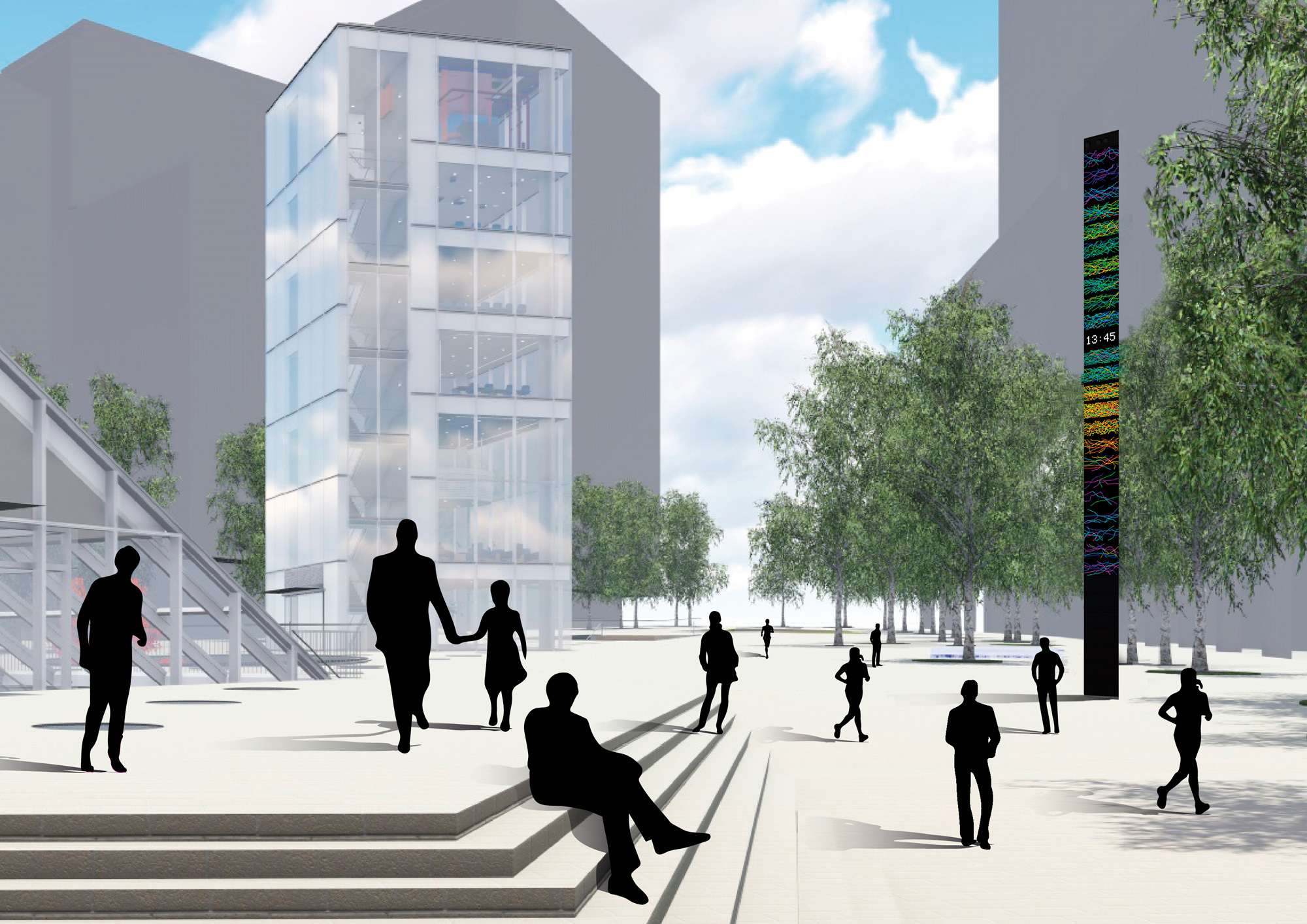 Data Tower is a 15-metre-tall obelisk equipped with 24 LED-tile segments on its two sides representing 24 hours, which communicate the pace of life and the current time. The idea of the 21st-century clock was already present in the artwork The Rhythm of São Paulo (2012), which takes a more mature form in Data Tower. In addition to actual time, Data Tower displays the pattern of the pace of life in the square during the last 23 hours. The lifestyles of residents, whether rushing to work, having a morning jog, walking the dog or reading a book in the square, are the components of each hour when a new pattern is composed and displayed on the obelisk. Hence, the behaviour of people in the square is transformed into colours and lines, which each hour form the pattern of a correspondent LED-display on the monolith. The idea is to take advantage of the central point of the location and, by using surveillance cameras to track people in the square 24/7, to capture the movement and amount of people throughout the day. Being watched and traced is an inevitable part of the information and surveillance age today. Underlying this fact, we have decided to track people and life in the square and let them generate data in the form of colour and lines. Hence, the data can be seen as an artistic material, which is sculptured by us as an artists and by an interactive system that has direct post-participative input from the people in the square. By sculpturing data in this way, the art installation demonstrates the pace of life in the square for the last 23 hours. Hence, one is able to see which hour is the most active or empty in the location. Maybe during weekends, Data Tower shows more slow or relaxed traces generated by people in comparison to weekdays. Pedestrians and their speed have been not random choices for us, we were quite inspired by the early studies of Borstein & Borstein, who had discovered in the 1970s a positive correlation between the speed of pedestrians and size of the city. In short, it was found that the speed of people is descriptive for a place and other way round. Concept-wise we have the same departure point as in the case of The Rhythm of City and The Rhythm of São Paulo: capturing and artistically forwarding a city’s pace of life. In this sense, all three works are very much related to representing our search for the rhythm of life in an urban space. While The Rhythm of São Paulo and The Rhythm of City talk about the pace of life in the virtual dimension of the city, Data Tower creates a dialogue between the place and its residents. To be more exact, it communicates the rhythm of life in the public space, while people compose the actual artwork through living their everyday lives. Data Tower aims to reflect the life and culture of the square, while creating a new relationship between residents and the artwork. Data Tower was among 4 finalists for the Green Square Library and Plaza in Sydney public art commission.