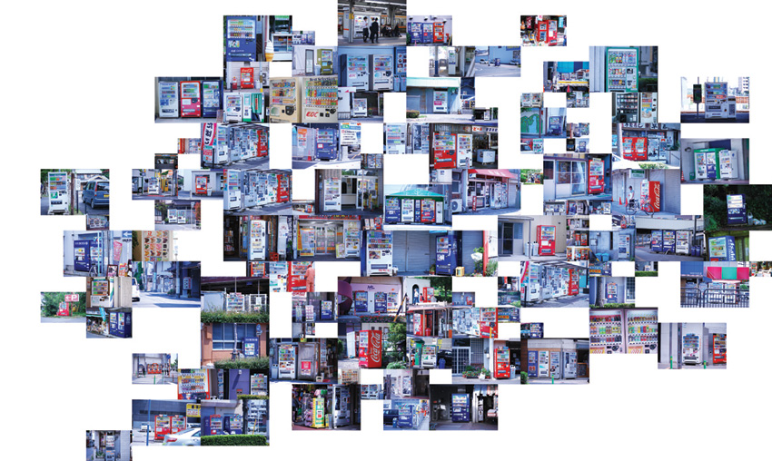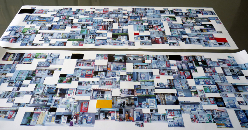 Execution#X is an art project that combines photography, manual and machine-based generative art, game-art, and participation. Starting with photography, over 500 vending machines in Japan were collected by taking photographs. This huge collection was arranged on a canvas by a computer algorithm written in Processing. The generative image composition algorithm places photos as a continuous path on a determined canvas. It means, every execution of the algorithm results an unique image composition. Second, the same instructions of the algorithm are applied as a game rules for manual generative approach (see the video below). Hence, machine-based and manual generative techniques are mixed and converted into a game. The players are asked to paint image-sized shapes (3 different sizes) on a canvas until there are no possibilities left for placing a shape. Concerning audience participation, we asked the visitors of the exhibition to play with us or against each other, and thus participate in the process and understand the rules.