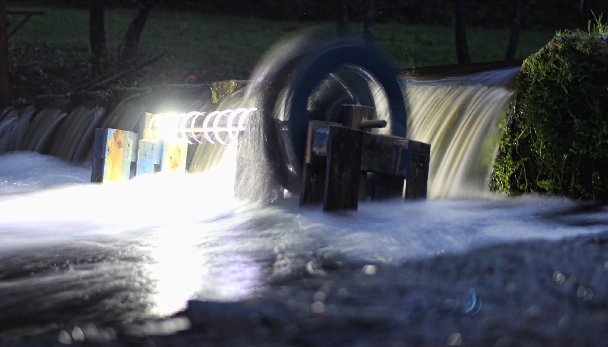 The work was produced while in residency 12 Miradas Riverside in Galicia, North of Spain. We were particularly interested in watermills, which used to be applied for various works in the past like making flour, for iron works, producing energy and more. However, today only few mills are functioning. From this came an idea to make a mill that produces a light play on the local river. We have used materials what we had: pallets and light torches.