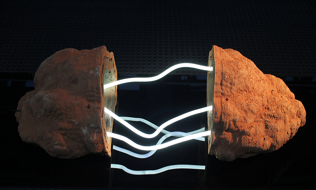 2023 ceramic sculpture (two of 50 x 50 x 50cm, neon tube) 3D printing with robotic arm, generative AI