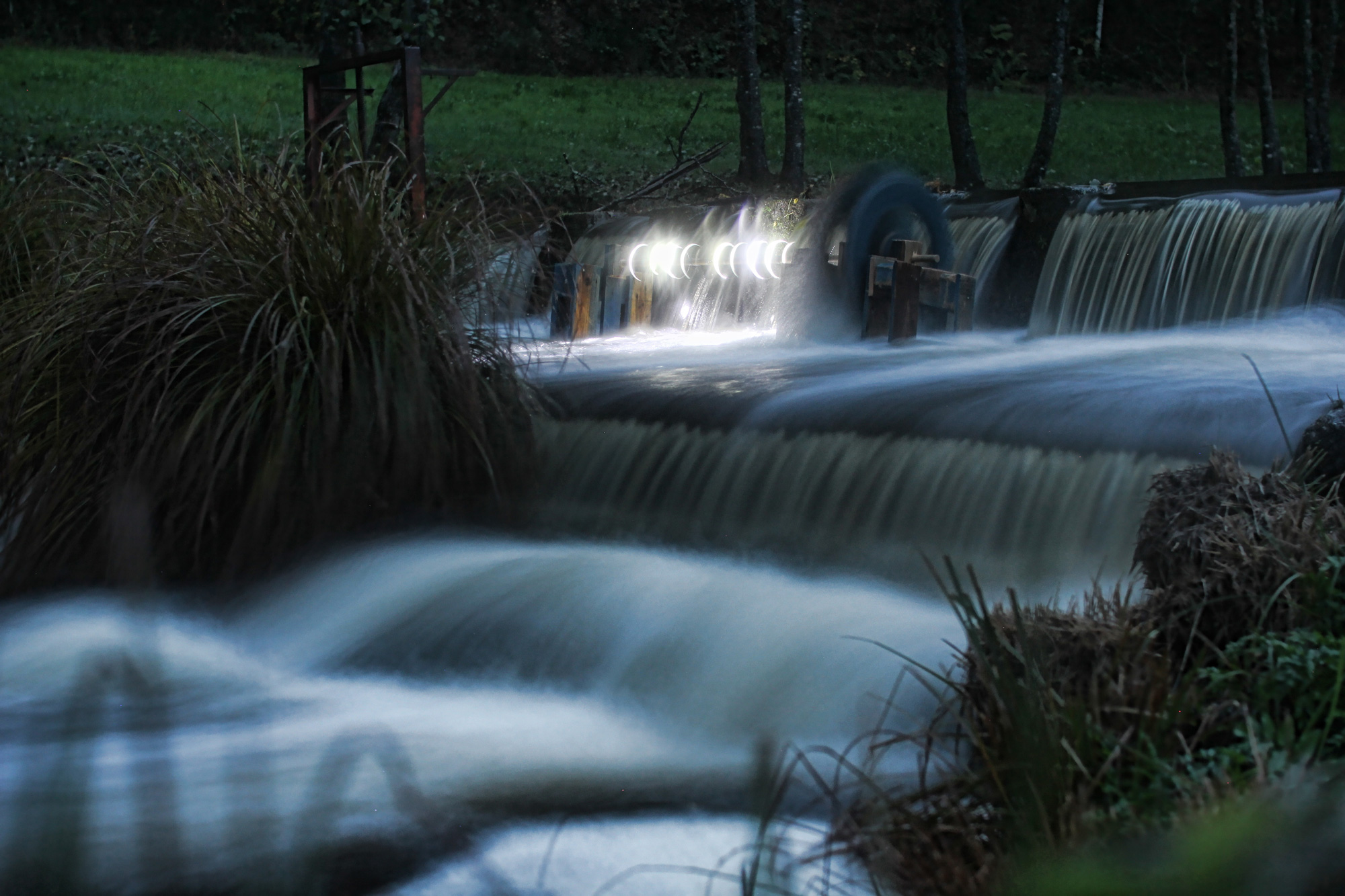 The work was produced while in residency 12 Miradas Riverside in Galicia, North of Spain. We were particularly interested in watermills, which used to be applied for various works in the past like making flour, for iron works, producing energy and more. However, today only few mills are functioning. From this came an idea to make a mill that produces a light play on the local river. We have used materials what we had: pallets and light torches.