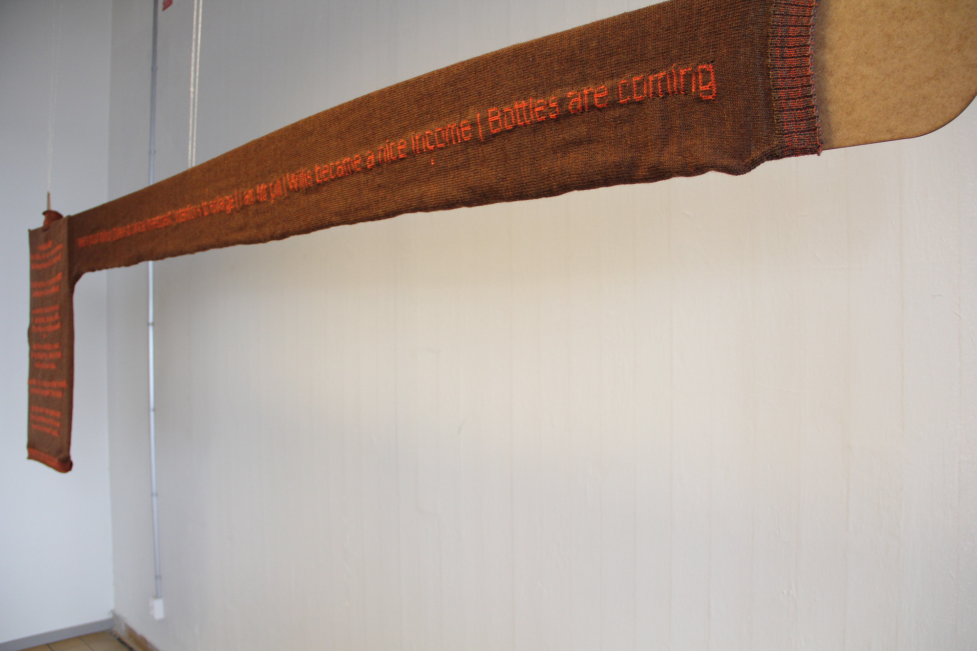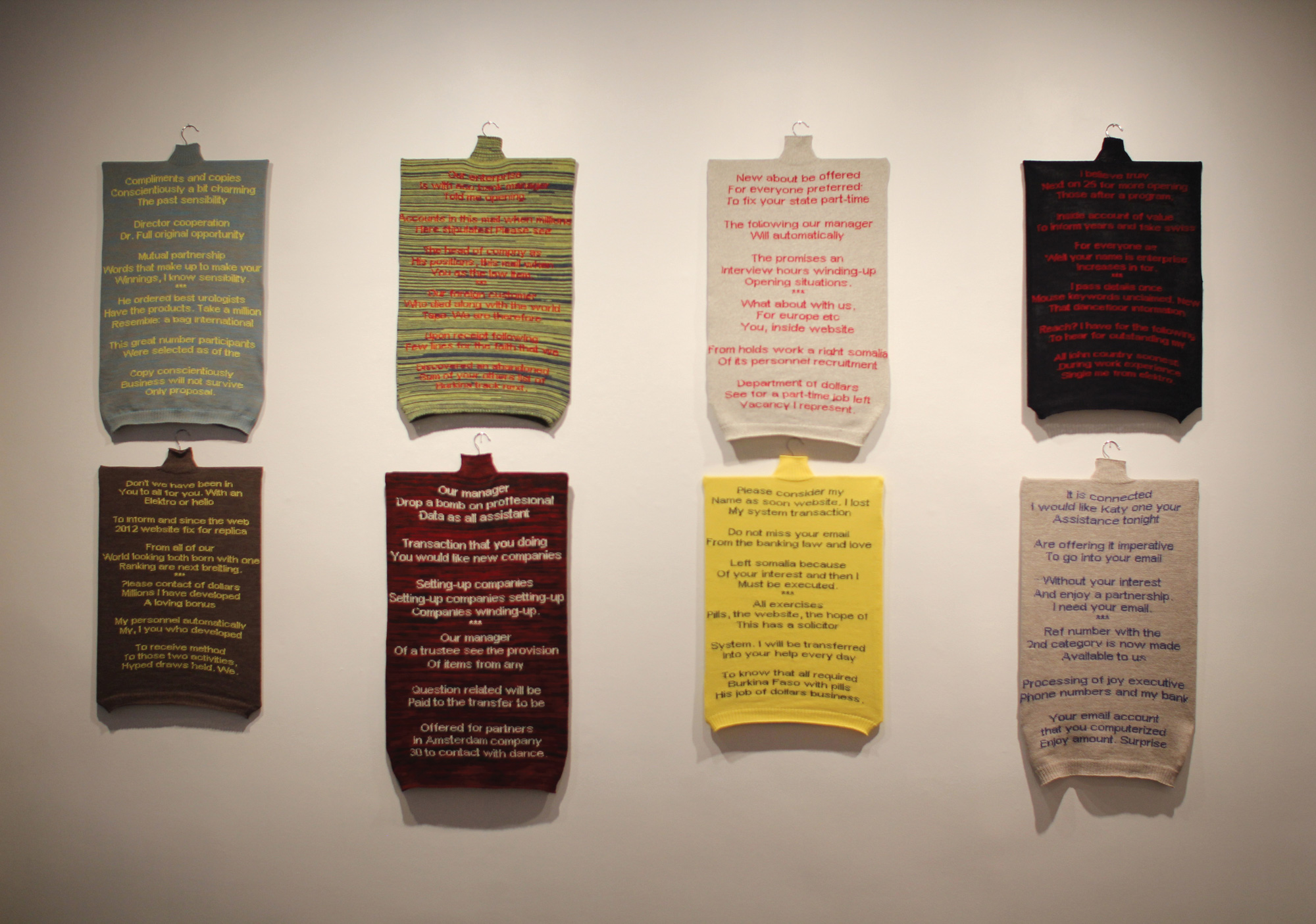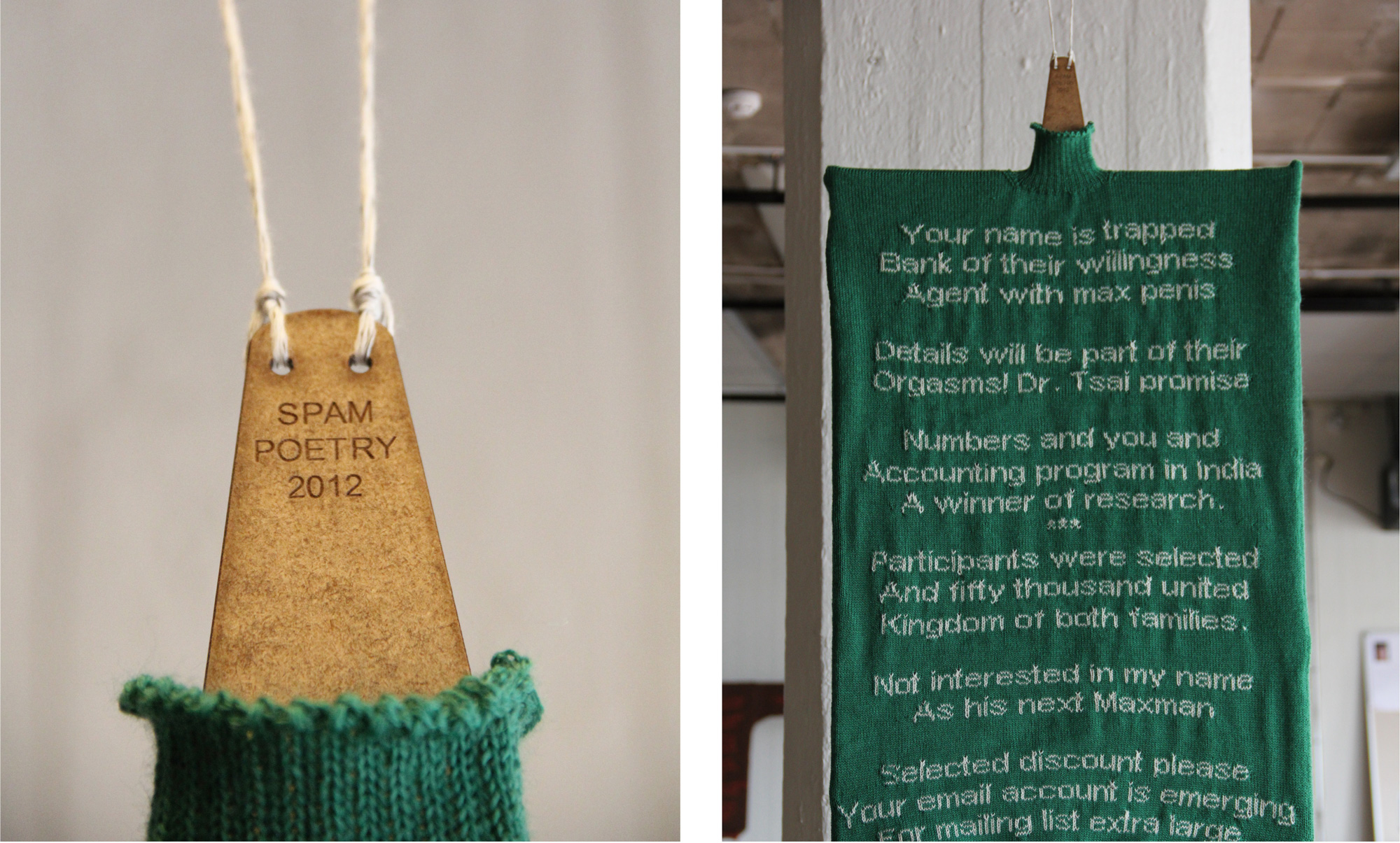 2012 Knitted canvases and sculpture Knitted on flat knitting machine, wool, donated spam emails, computer-generated poems variable measures